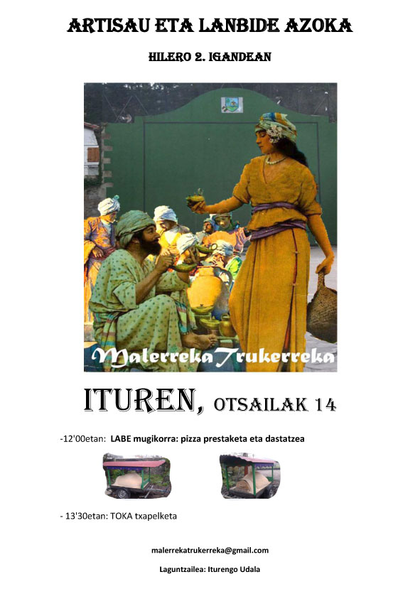 IGANDEAN AZOKA ITURENEN Data: otsaila 12, 2016 Lortu esteka Facebook X Pinterest Helbide elektronikoa Beste aplikazio batzuetan Hilabeteko bigarren igande guzietan egiten duten bezala, azoka izanen da heldu den igandean Iturenen. Bi ekitaldi izanen dira azokarekin batean: 12'00etan: LABE mugikorra: pizza prestaketa eta dastatzea 13'30etan: TOKA txapelketa