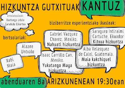Udazken hontan Ekuador, Guatemala, Mexiko, Kolonbia, Txile, Bolivia eta Beninetik etorritako 18 lagun daude Euskal Herrian proiektuan parte hartzen eta hoietatik 4 kide izanen dira gure artean eta nork bere hizkuntzan kantatuko du eta bere hizkuntza-komunitatearen berri emanen digu. Baztango bi bertsolarik informazio hori bertsotara eramanen dute.